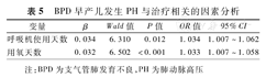 PH组早产儿呼吸机使用天数、用氧天数、住院天数长于非PH组,差异有统计学意义(P<0.05);两组PS使用率差异无统计学意义(P>0.05),见表4。Logistic回归分析显示,呼吸机使用天数、用氧天数是BPD早产儿发生PH的独立危险因素,详见表5。