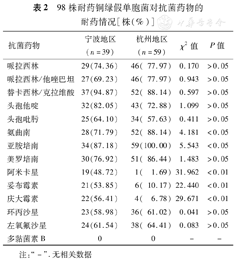 | 抗菌药物 | 宁波地区(n=39) | 杭州地区(n=59) | χ2值 | P值 |