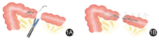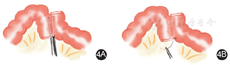 Overlap也是侧侧吻合的一种方式。2017年Zhou等[17]以及2018年王楠等[18]均报道了采用Overlap方法进行腔内结肠吻合,吻合步骤为分别在近端肠管结肠带的断端处和远端结肠距断端6 cm结肠带上开孔,进入肠腔,从尾侧将直线吻合器两侧臂分别置入远端和近端结肠肠腔内,牵拉远近端结肠系膜,使远端和近端结肠残端重叠、且结肠带对结肠带,击发后完成侧侧吻合,见图4。作者发现,与传统吻合组比较,Overlap吻合组患者总的手术时间缩短,术中出血量较少,腹壁切口长度更短,术后并发症两者并无差别。作者认为,此种方法的优点在于对系膜长度要求更低,可以由尾侧亦可由头侧置入闭合器,可根据操作方便灵活应用,吻合方式比较灵活。