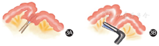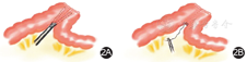 2012年,Ikeda等[12]报道了采用逆蠕动侧侧吻合,吻合步骤:近端远端肠壁均用闭合器离断,将两端拉向中线,于肠壁断端系膜对侧处切开,进入肠腔,将张开的直线切割闭合器分别置入两侧肠管断端内,使用切割闭合器完成结肠带对结肠带侧侧吻合后,缝线2~3针间断缝合共同开口,提起缝合线后,以切割闭合器垂直于系膜关闭共同开口;见图3。此类方法闭合共同开口后,因其吻合口呈三角形,学者命名其为"三角吻合"。2014年,Iorio和Blumberg[13]采用此种方法进行腔内吻合,并采用病例对照研究的方法,比较了左半与右半结肠全腔镜下吻合后的并发症、住院时间及康复情况,研究纳入左半结肠癌35例、右半结肠癌70例,结果显示,全腔镜左半、右半结肠癌手术的上述指标差异并无统计学意义。2014,Wang等[14]采用此种方法对11例左半结肠癌患者术中进行吻合,经阴道取标本,取得较好的近期效果,为类似的患者提供了一种可选择的方法。2018年,王铁等[15]和苏昊等[16]均采用腔镜下三角吻合的方法,也取得较为满意的近期效果。与顺蠕动的方法相比,采用此种方式的优点在于,采用切割闭合器关闭共同开口,技术难度低,且减少了镜下缝合。
