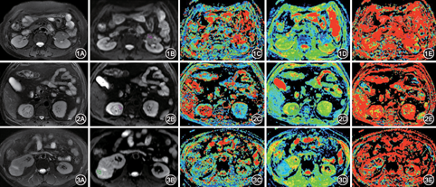 快速ADC (D*)值(假性扩散系数)依次为(33.31±18.21)×10-3mm2/s,(30.03±18.83)×10-3mm2/s,(17.83±17.30)×10-3mm2/s,其中良性肿瘤组与非透明细胞癌组的差异有统计学意义(P<0.05),而良性肿瘤组与透明细胞癌组,透明细胞癌组与非透明细胞癌组之间差异无统计学意义。慢速ADC (D)(单纯扩散系数)值依次为(0.78±0.31)×10-3mm2/s,(1.83±1.56)×10-3mm2/s,(0.96±0.25)×10-3mm2/s,3组中良性肿瘤组与透明细胞癌组,以及透明细胞癌组与非透明细胞癌组的差异均有统计学意义(均P<0.05),而良性肿瘤组与非透明细胞癌组的差异无统计学意义。灌注相关体积分数ADC (f)值在3组的数值依次为33.5%±0.12%、25.2%±0.09%、25.7%±0.15%,3组之间的差异均无统计学意义(图1,图2,图3)。