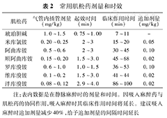 4.常用肌松药ED95及气管内插管剂量、追加剂量、起效时间和临床作用时间见表1, 表2。