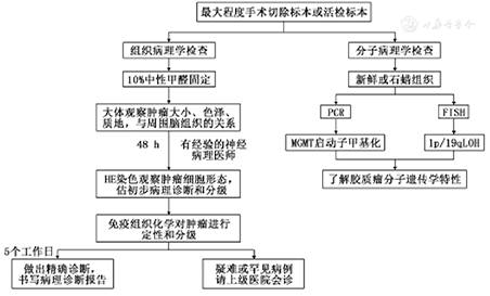 在胶质瘤的病理诊断过程中,病理科医师应获取最大程度的肿瘤组织标本,并由神经病理专科医师参与复检,有条件的医院可开展分子病理学检查,具体流程见图1。