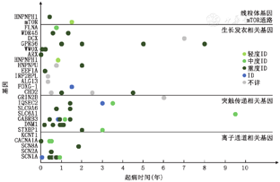 图1呈现出每一例具有基因突变的LGS患者的起病年龄和智力障碍情况。携带离子通道相关基因、突触传递相关基因突变的LGS患者存在更为严重的智力障碍。在合并生长发育相关基因突变的LGS患者中,具有GPR56、WWOX、ARX、EEF1A等基因突变的患者可能更容易伴有严重的智力障碍。