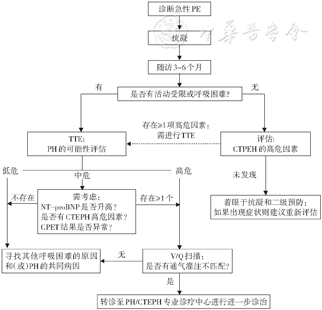 如果患者存在持续性呼吸困难,临床医生应行超声心动图检查以评估是否出现长期并发症如PH。如果超声心动图提示PH高度可能,或者PH中度可能且合并NT-proBNP升高,存在CTEPH的高危因素时,临床医生应考虑进行V/Q显像检查。当V/Q显像提示通气/灌注不匹配时,建议患者转诊到PH/CTEPH专业诊疗中心进一步诊治。如果V/Q显像结果阴性但对患者的症状无法找到合理解释,临床医生可以考虑进行心肺运动试验(CPET)来进一步衡量患者呼吸和循环系统储备能力。CPET结果提示最大有氧运动能力降低时,建议进一步随访[19, 20],另外,CPET对于识别可疑CTEPH患者以及合并左心疾病和(或)其他呼吸系统疾病患者也有参考价值。