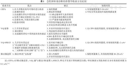 | CTPA | 1.在大多数医院均可随时进行检查 2.准确性较好 3.在前瞻性研究中得到强有效性验证 4.结果不确定率较低(3%~5%) 5.若排除PE,可提出替代诊断 6.检查时间短 | 1.辐射暴露 2.碘造影剂暴露 (1)碘过敏和甲亢患者慎用 (2)妊娠及哺乳期妇女慎用 (3)严重肾功能衰竭禁用 3.因容易实施造成过度应用 4.对亚段PE的诊断意义尚不明确 | 1.有效辐射剂量3~10 mSva 2.年轻女性乳腺组织辐射暴露显著 |