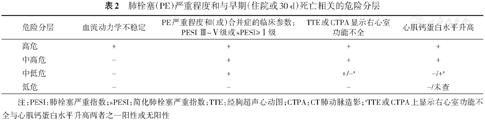| 危险分层 | 血流动力学不稳定 | PE严重程度和(或)合并症的临床参数:PESI Ⅲ~Ⅴ级或sPESI≥Ⅰ级 | TTE或CTPA显示右心室功能不全 | 心肌钙蛋白水平升高 |