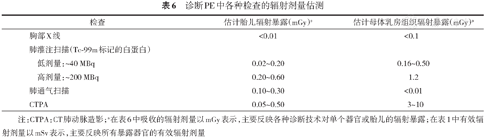 注:CTPA:CT肺动脉造影;a在表6中吸收的辐射剂量以mGy表示,主要反映各种诊断技术对单个器官或胎儿的辐射暴露;在表1中有效辐射剂量以mSv表示,主要反映所有暴露器官的有效辐射剂量