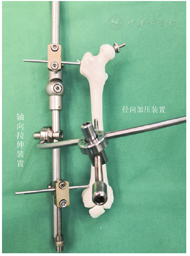 基于以上原因,我们设计了儿童股骨骨折复位器,复位器由轴向拉伸复位装置和径向加压复位装置两部分组成。轴向拉伸复位装置用于恢复骨折长度和复位骨折成角,通过直接固定于股骨骨折远近端的钢针直接起作用;径向加压装置主要用于纠正骨折断端的侧方和前后移位,对于骨折成角的复位亦有帮助。应用骨折复位器复位后,骨折获得临时稳定外固定,患肢连同复位器可随意活动,方便术中透视,可以在不需要人工辅助的情况下进行不同体位下的骨折部位X线透视。术者可以远离放射区域,减少术者的放射暴露。