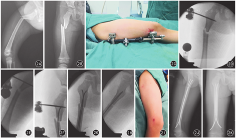术前30 min预防性应用抗生素。全身麻醉。患儿仰卧于透X线手术床。透视下于股骨远端生长板近端1~2 cm外侧横行打入1枚直径5 mm的Schanze钉,再于股骨骨折近端外侧打入1枚直径3 mm克氏针后,安装复位器(专利号ZL201821004616.6,图1)。首先安装轴向拉伸复位装置,将Schanze钉和克氏针分别固定于复位器近端、远端的夹针座,锁紧近端螺母和夹针座;然后旋转轴向拉伸螺杆,通过远端夹针座向骨折远端移动,牵拉复位股骨转子下骨折,纠正股骨骨折重叠、恢复股骨长度后,锁紧轴向拉伸螺杆的螺母。术中X线透视,观察股骨转子下骨折正侧位对位、对线情况:如果骨折对位、对线满意,则准备逆行置入弹性髓内钉;如果骨折复位不佳,则将径向加压复位装置放置于向前或前外移位的骨折端前方,并将其固定于轴向拉伸装置,再将径向加压复位螺钉经皮固定在向前或前外方移位的骨折端的骨皮质处,通过逐步拧紧加压复位螺纹钉获得股骨骨折复位。确认骨折复位后,由股骨远端置入弹性髓内钉,先置入内侧钉,通过骨折断端到达到近折段后,拆除复位器;再于Schanze钉打入孔打入外侧弹性髓内钉,术中透视调整外侧弹性钉头位于大转子骨突起处,内侧钉头位于股骨颈内或股骨距区域,骨折复位满意。屈伸膝髋关节,并旋转股骨,确定骨折固定稳定后,剪断弹性髓内钉钉尾,保留1.5 cm露于骨皮质外并稍作折弯,埋于皮下。