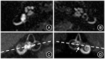 采用3.0T MR机(德国Siemens Magnetom Verio 3.0),16通道头线圈三维液体衰减反转恢复(3D-FLAIR)序列采集,重复时间(TR)6 000 ms,回波时间(TE)388 ms,反转时间(TI)2 200 ms,4次采集,空间分辨率为0.7 mm×0.7 mm×0.7 mm[视野(FOV)138 mm×184 mm,矩阵196×256],扫描时间5.5 min。MR检查前24 h由经验丰富的耳科主治医师操作,用生理盐水8倍稀释后的钆喷酸葡胺注射液(商品名:马根维显,广州先灵药业有限公司)经鼓膜穿刺注入鼓室,注射后患者头后仰斜躺休息1 h,并嘱其尽量少说话和做吞咽动作。如果3D-SPC-IR-FLAIR上内耳各结构均未发现高信号的钆造影剂,即认为内耳MR钆造影失败。