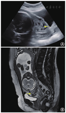 (1)1例CSP-Ⅰ型患者,既往有反复着床失败病史,卵巢功能减退,超声评估子宫下段剖宫产切口部位残余肌层厚度5 mm,患者及家属有强烈继续妊娠意愿,经全科病例讨论及充分医患沟通,采取期待治疗。产检筛查超声反复提示凶险性前置胎盘伴胎盘植入,孕31+周因羊水过少行剖宫产+手取胎盘+子宫下段宫颈提拉式缝合+双侧子宫动脉下行支结扎+子宫B-lynch缝合术,术中出血2 100 ml,新生儿出生体重1 430 g,1分钟Apgar评分9分,5分钟Apgar评分10分,经新生儿重症监护室(NICU)治疗后出院,现体健。(2)2例HCSP患者均为CSP-Ⅱ型,接受经阴道剖宫产瘢痕部位妊娠囊穿刺抽吸减胎术,术中于妊娠囊局部注射高渗葡萄糖溶液进一步减灭妊娠组织。其中1例患者孕中晚期产科超声及磁共振成像(MRI)反复提示妊娠组织完全性前置伴植入(图1),于孕29+周因产前出血行剖宫产+手取妊娠组织+子宫下段间断8字缝合+双侧子宫动脉下行支结扎+子宫B-lynch缝合术,术中出血3 200 ml,术后病理示前置伴植入的妊娠组织为梗死退变的胎盘组织。新生儿出生体重1 450 g,1分钟Apgar评分7分,5分钟Apgar评分9分,经NICU治疗后出院,现体健。另1例患者未于本院建档产检,经随访获知患者于孕35+周因"前置胎盘伴产前出血"行剖宫产术,新生儿出生体重3 000 g,现体健。(3)1例CSP-Ⅲ型患者行腹腔镜盆腹腔粘连松解+子宫瘢痕妊娠组织清除+子宫修补术,术后15个月时第1次胚胎移植(解冻周期单囊胚移植),早孕期超声提示正常宫内妊娠,孕期平顺,孕37+周经剖宫产术分娩,新生儿出生体重3 450 g,现体健。(4)24例CSP-Ⅰ型或Ⅱ型患者行宫腔镜子宫瘢痕妊娠组织清除术±子宫动脉栓塞术。其中22例(91.7%)患者首次宫腔镜手术治疗成功,术后1~2个月血β-hCG降至<5 mU/ml;其余2例(8.3%)患者因持续性CSP再次行宫腔镜子宫瘢痕妊娠组织清除术。4例患者术后10~18个月历经1~2次移植周期获得临床妊娠,均妊娠至足月经剖宫产术分娩,无再发性CSP(RCSP)、胎盘植入、子宫破裂、产后出血、新生儿窒息等严重并发症。6例患者术后10~48个月历经1~3次移植周期未获临床妊娠,无再妊娠意愿。其余14例患者目前仍处于辅助生殖助孕治疗周期中。