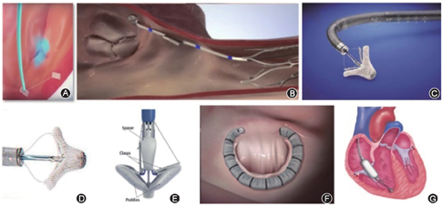 FORMA (Edwards Lifesciences公司,美国)通过在三尖瓣瓣口处植入泡沫聚合物填充气囊,通过缩小反流口面积以及为瓣叶提供附着点而消除TR(图1G)。FORMA包括气囊、连接于气囊心室面的锚定器以及心房面的固定导管。在X线及TEE引导下经左侧腋静脉植入导管,右心室造影后送入锚定器及气囊,锚定器定位于右心室心尖部,气囊定位于三尖瓣瓣环中央,固定锚定器,心房面的固定导管远端于穿刺处埋入皮下锚定。Perlman等[22]于2015年首次报道使用FORMA植入治疗7例重度TR患者,植入后3例患者由重度转为中度,4例由重度转为轻度。18例患者的1年随访结果显示FORMA植入在改善了患者TR的同时伴随右心室容积减小,但在植入过程中出现右心室穿孔及锚定装置脱位各1例[24]。Asmarats等[25]报道了19例接受FORMA植入的重度TR患者长期临床预后结果,植入成功率为89%,无一例30 d死亡发生,平均随访时间为32个月,累计死亡率为24.0%,随访期间口服抗凝药物下发生肺栓塞1例,67%的患者末次随访时TR仍维持在重度以下。FORMA锚定器定位于右心室心尖,出血相关并发症发生率高,同时由于腔内留置物较多,存在血栓相关并发症发生的可能,同时,其适应证较为严格,仅适用于中心性TR,目前临床结果显示远期效果有待改善。