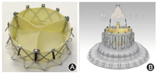 NaviGate (NaviGate Cardiac Structures公司,美国)是设计用于原位三尖瓣置换的介入自膨胀生物瓣膜(图3 A)。Navia等[32]于2017年首次报道了接受NaviGate治疗的2例重度TR患者。在X线、TEE及心内超声引导下,通过经心房/颈静脉途径植入导管并释放生物瓣膜,术后1例患者TR由重度转为轻度,另1例由重度转为中度瓣周漏并在随访第6个月时死于缺血性结肠炎并发败血症。目前共有11例患者接受Navi Gate植入,所有患者术后TR均有改善,1例患者发生房室传导阻滞并需要植入起搏器,随访期间3例患者死亡[33]。NaviGate瓣膜依靠瓣周的锚定装置锚定于瓣环上,为获得可靠的锚定及预防瓣周漏,常选取大于瓣环5%~10%的规格植入,这影响了房室环收缩以及术后右心功能恢复,并增加了瓣周结构损伤导致发生房室传导阻滞的可能性。