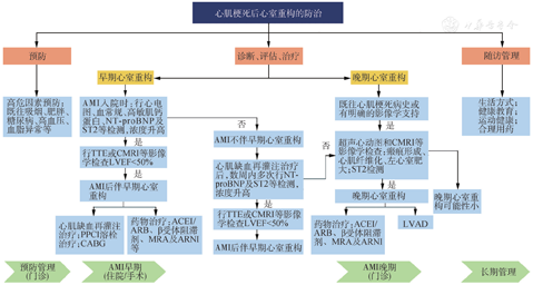注:AMI:急性心肌梗死;NT-proBNP:N末端B型利钠肽前体;ST2:致癌抑制因子2; TTE:经胸超声心动图;CMRI:心脏磁共振成像;LVEF:左心室射血分数;PPCI:急诊经皮冠状动脉介入治疗;CABG:冠状动脉旁路移植术;ACEI/ARB:血管紧张素转化酶抑制剂/血管紧张素Ⅱ受体拮抗剂;MRA:盐皮质激素受体拮抗剂;ARNI:血管紧张素受体-脑啡肽酶抑制剂;LVAD:左心室辅助装置