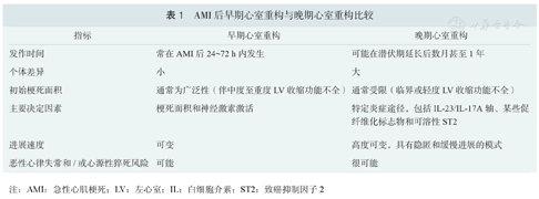 AMI后心室重构,是指AMI后心室持续发生的大小、形态、结构和功能的改变过程,可表现为左心室扩大、左心室射血分数(left ventricular ejection fraction,LVEF)降低和/或局部室壁活动异常,是决定AMI后心脏事件发生率和远期预后的主要因素[5]。在患者出现HF症状前,心室重构多表现为无症状的结构和功能异常(心脏的收缩或舒张功能不全)。AMI后心室重构可分为早期重构和晚期重构:(1)早期心室重构常在AMI后24~72 h内发生,主要表现为梗死面积扩大和心室腔扩张,心肌细胞坏死及心肌顿抑;(2)晚期心室重构主要表现为心肌细胞肥大、凋亡和弥漫性纤维化,通常在数周内(偶尔在数月内)发生,晚期心室重构个体化差异大,可以延续数月甚至1年。早期心室重构与晚期心室重构间主要差异见表1[6]。