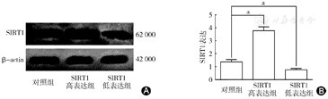 A图示Western blot检测质粒转染效率;B图示Western blot检测质粒转染结果柱状图。对照组、SIRT1高表达组、SIRT1低表达组的慢病毒转染分别为(1.37±0.18)、(3.77±0.30)和(0.76±0.10),SIRT1高表达组的慢病毒转染较做手术组明显升高;SIRT1低表达组的慢病毒转染较对照组明显降低。aP<0.05,差异有统计学意义。SIRT1:沉默信息调节因子1;β-actin:β-肌动蛋白