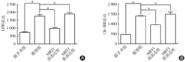A图示LDH检测心肌损伤;B图示CK-MB检测心肌酶活性。与假手术组比较,心肌缺血40 min后再灌注120 min,模型组血清心肌酶CK-MB、LDH活性明显增加;SIRT1高表达组CK-MB、LDH水平较模型组明显降低;SIRT1低表达组CK-MB、LDH水平较模型组明显升高。aP<0.05,差异有统计学意义。SIRT1:沉默信息调节因子1;CK-MB:肌酸激酶MB;LDH:乳酸脱氢酶