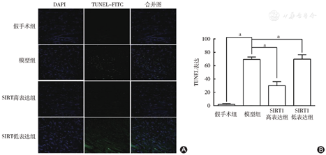 A图示TUNEL法检测MIRI后心肌凋亡阳性细胞;B图示TUNEL法检测MIRI后心肌凋亡阳性细胞结果柱状图。假手术组、模型组、SIRT1高表达组及SIRT1低表达组的心肌凋亡阳性细胞分别为(2.06%±1.16%)、(69.36%±3.66%)、(30.06%±6.10%)和(69.74%±6.74%)。模型组的凋亡阳性细胞数量明显高于假手术组;SIRT1高表达组的凋亡阳性细胞数量明显低于模型组。aP<0.05,差异有统计学意义。SIRT1:沉默信息调节因子1;MIRI:心肌缺血再灌注损伤