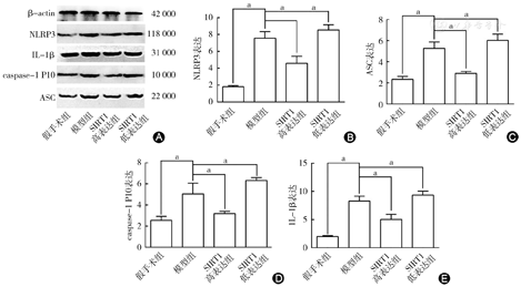 A图示Western blot法检测焦亡相关蛋白表达;B图示Western blot检测NLRP3蛋白表达结果柱状图;C图示Western blot检测ASC蛋白表达结果柱状图;D图示Western blot检测caspase-1 P10蛋白表达结果柱状图;E图示Western blot检测IL-1β蛋白表达结果柱状图。与假手术组比较,模型组NLRP3、ASC、caspase-1 P10、IL-1β蛋白表达明显升高;SIRT1高表达组NLRP3、ASC、caspase-1 P10、IL-1β蛋白表达较模型组明显降低;SIRT1低表达组NLRP3、ASC、caspase-1 P10、IL-1β蛋白表达较模型组明显升高。aP<0.05,差异有统计学意义。SIRT1:沉默信息调节因子1;NLRP3:核苷酸结合寡聚化结构域样受体蛋白3;ASC:凋亡相关斑点样蛋白;caspase:胱天蛋白酶;IL-1β:白细胞介素-1β