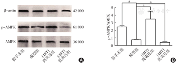 ±s)表示,假手术组和模型组、模型组和SIRT1高表达组、模型组和SIRT1低表达组、SIRT1高表达组和AMPK信号通路抑制组的组间对比采用独立样本t检验,P<0. 05为差异有统计学意义。柱状图使用Graph Pad Prism 7制作。