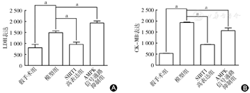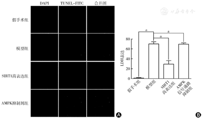 A图示TUNEL法检测MIRI后心肌凋亡阳性细胞;B图示TUNEL法检测MIRI后心肌凋亡阳性细胞结果柱状图。假手术组、模型组、SIRT1高表达组、AMPK信号通路抑制组的心肌凋亡阳性细胞分别为2.06%±1.16%、69.36%±3.66%、30.06%±6.10%和69.74%±6.74%。模型组的凋亡阳性细胞数量明显高于假手术组;SIRT1高表达组的凋亡阳性细胞数量明显低于模型组。aP<0.05,差异有统计学意义。SIRT1:沉默信息调节因子1;AMPK:单磷酸腺苷激活的蛋白激酶;MIRI:心肌缺血再灌注损伤;LDH:乳酸脱氢酶