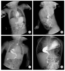 食管裂孔疝在胸部X线片和CT上都有比较特征性的表现,即食管下端和部分胃体疝入纵隔。诊断的金标准是上消化道造影,可见贲门和部分胃组织通过食管裂孔疝入纵隔。在巨大型食管裂孔疝患儿,可见到全胃甚至腹腔内其他脏器组织也一并疝入纵隔(图2)。CT检查可增加对食管裂孔疝诊断的可视性,CT三维重建图像更增加了对食管裂孔疝诊断的敏感性。