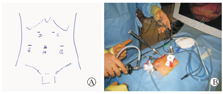 (1)推荐选择4 Trocar法,其中1支Trocar用于牵拉环绕食管下端的吊带由助手持握,可使食管在术中保持一定张力,便于疝囊的游离和粘连食管的游离,减少食管损伤的可能。