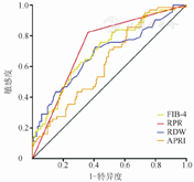 将单因素分析中有统计学意义的指标纳入多因素Logistic回归分析,结果显示INR(OR=12.822, 95% CI 4.366~37.652,P<0.01)、RPR(OR=4.758, 95% CI 1.621~13.965,P<0.01)和RDW(OR=1.189, 95% CI 1.026~1.376,P<0.05)均为影响戊型肝炎患者发生相关肝衰竭的独立危险因素(表2)。同时对FIB-4和APRI的诊断能力进行了分析,发现RPR、FIB-4、RDW和APRI预测HEV发生相关肝衰竭的ROC曲线下面积(AUC)分别为0.73(95%CI 0.67~0.79),0.70(95%CI 0.64~0.76),0.68(95%CI 0.61~0.74)和0.62(95%CI 0.56~0.69),RPR和RDW与FIB-4和APRI预测价值相比,差异无统计学意义(P>0.05)(表3,图1)。