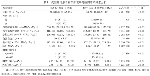 | 危险因素 | HEV-LF患者(n=62) | HEV-non-LF患者(n=152) | t/χ2/U值 | P值 | |