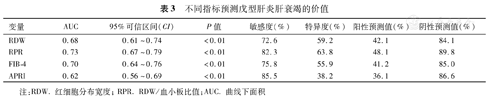本研究有如下不足:第一,有不同基因型的HEV病毒,没有对所有感染病毒的基因型进行分类,也没有将RDW、RPR水平与不同基因型进行比较;第二,没有收集HEV RNA数据,也不能分析RPR和HEV RNA水平之间的相关性[21,22];第三,在研究两者对戊型肝炎肝衰竭患者预后预测能力时,对年龄、性别及其他生化指标考虑的基础上并没有考虑治疗过程中药物种类及使用、上消化道出血、腹水等因素是否影响预后。