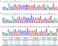入院后予完善相关检查。血常规、尿常规、粪常规、生化、血脂未见明显异常。甲状腺功能:FT3 5.21 pmol/L,FT4 18.26 pmol/L,TSH>150.000 mU/L。TRAb 0.30 U/L(0.00~1.75),降钙素<2.00 pg/mL(0.0~11.5)。皮质醇节律、生长激素、胰岛素样生长因子Ⅰ、胰岛素样生长因子结合蛋白3、性激素、催乳素等均正常范围。甲状腺彩超:甲状腺术后,残余甲状腺两侧叶弥漫性病变、多发混合性及囊性结节(ACR-TIRADs 1~2类)。垂体MR平扫+动态增强考虑未除外微腺瘤可能,建议结合临皮下注射,q8h共3次,于0、2、4、6、8、24 h分别抽血查甲状腺功能)结果提示,该患者2~24 h的TSH抑制率为52.0%~66.9%(按TSH 150 mIU/L计算,表1)。综合分析患者病史及检查,考虑患者垂体型甲状腺激素抵抗综合征与垂体TSH瘤相鉴别。后送外周血行甲状腺激素受体(THR)β(1-10号外显子)基因检测,结果呈阳性,考虑受检者携带致病的THRβ基因变异位点,明确其RTH诊断;再次完善其父母甲状腺功能及THRβ基因检测,结果显示患者父母甲状腺功能处于正常范围,基因检测结果未见异常(图3)。
