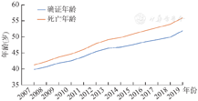 2007-2019年死亡的艾滋病患者确证HIV感染时年龄(39.8±12.97)岁上升到(51.9±16.60)岁;死亡时年龄由(41.2±12.81)岁上升到(55.9±15.48)岁;平均生存时长从1.4年延长到4.0年。见图1。