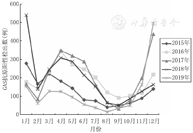 2015年至2019年GAS抗原各个年龄段均有检出,5年的曲线趋势一致,均以3~8岁阳性率较高,其中4~ 6岁阳性率最高,1岁以下的患儿和大于11岁的患儿GAS抗原阳性检出率低(图1)。