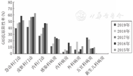 2015年至2019年深圳儿童医院GAS抗原阳性检出率分病区由高到低依次为皮肤科门诊(52.34%)、急诊科门诊(47.74%)、内科门诊(37.36%)、感染病区(19.71%)、五官科病区(10.27%)、内科病区(8.63%)、外科病区(7.34%)、新生儿病区(0%)(图3)。