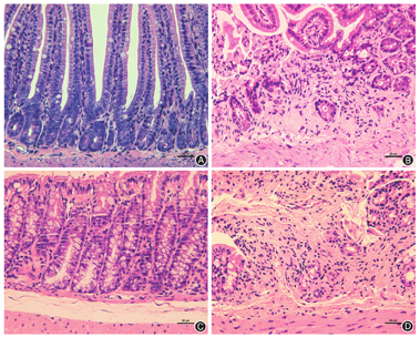 研究发现肠上皮细胞反复暴露于高浓度胆汁酸是IBD发病的重要危险因素[9]。而IBD患者肠道内具有较高浓度的脱氧胆酸[10]。既往研究采用0.2%的脱氧胆酸喂养小鼠,建立IBD实验动物模型,发现干预8个月后小鼠结肠黏膜呈弥漫性增厚(约为正常厚度的2倍),固有层中有许多淋巴细胞和中性粒细胞以及较少的浆细胞炎性浸润,穿透至黏膜下层,形态学诊断为中度结肠炎[4]。本实验中对小鼠进行连续6个月脱氧胆酸干预,同样发现回肠及结肠黏膜受损,与既往研究结果基本一致。