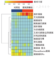 与对照组小鼠相比,脱氧胆酸组喂养24周小鼠的Chao值(186.14 ± 22.96比262.63 ± 12.90)、Simpson值(0.82 ± 0.07比0.94 ± 0.02)、Shannon值(3.92 ± 0.72比5.38 ± 0.50)明显下降(均P<0.01),提示脱氧胆酸组小鼠肠道菌群多样性明显降低。