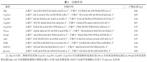 PCR 10 μl反应体系(Taq-mix 5 μl,上下引物各0.2 μl,模板DNA 0.6 μl,双蒸水4 μl),采用qPCR检测肝脏中小异二聚体伴侣受体(small heterodimer partner,Shp)基因和胆汁酸合成相关限速酶基因如胆固醇羟化酶亚型Cyp7a1、Cyp7b1、Cyp8b1、Cyp27a1以及回肠上有机溶质转运蛋白α(organic solute transporter α,Ost-α)、有机溶质转运蛋白β(organic solute transporter β,Ost-β)、顶端钠依赖胆汁酸转运蛋白(apical sodium-dependent bile acid transporter,Asbt)、法尼醇受体(farnesoid X receptor,FXR)、成纤维细胞生长因子15(fibroblast growth factor 15,FGF15)基因的转录情况。使用Ultrapure RNA Kit试剂提取组织总RNA,检测RNA浓度。使用EasyQuick RT MasterMix,采用两步法反转录生成cDNA。PCR反应条件为95℃预变性2 min,95℃变性15 s,59.2 ~ 60.8℃退火30 s,72℃延伸20 s,循环45次。内参基因选用β-actin,采用2-ΔΔCt法计算该基因的相对表达水平。各引物序列见表1。