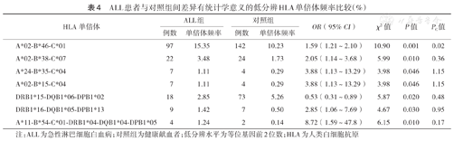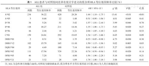 注:ALL为急性淋巴细胞白血病;对照组为健康献血者;低分辨水平为等位基因前2位数;HLA为人类白细胞抗原