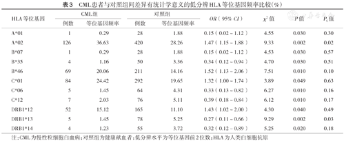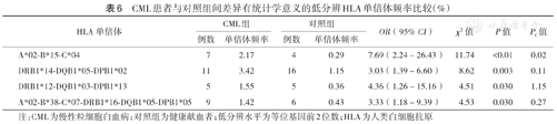 注:CML为慢性粒细胞白血病;对照组为健康献血者;低分辨水平为等位基因前2位数;HLA为人类白细胞抗原