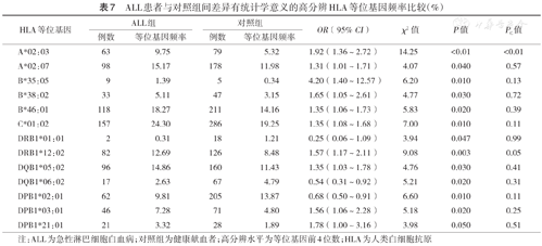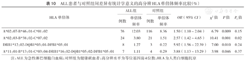注:ALL为急性淋巴细胞白血病;对照组为健康献血者;高分辨水平为等位基因前4位数;HLA为人类白细胞抗原
