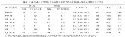 注:AML为急性髓系白血病;对照组为健康献血者;高分辨水平为等位基因前4位数;HLA为人类白细胞抗原