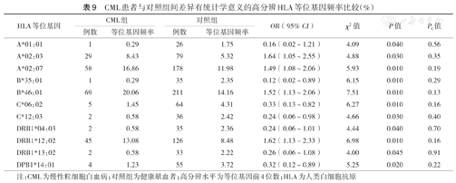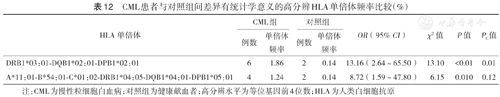 注:CML为慢性粒细胞白血病;对照组为健康献血者;高分辨水平为等位基因前4位数;HLA为人类白细胞抗原
