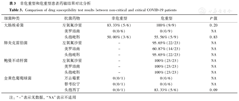 COVID-19患者危重型以男性患者居多,其容易合并多种细菌和真菌感染,且死亡率比非危重型患者高。危重型患者常合并感染细菌为鲍曼不动杆菌和肺炎克雷伯菌等医院获得性菌株,其耐药性较高。