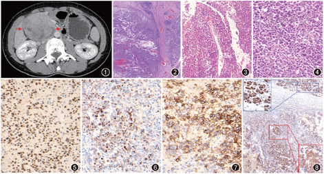患者女,33岁。因右中上腹隐痛1个月余于2020年1月27日就诊于南京医科大学第一附属医院。体检:右中上腹部触及6 cm×6 cm质硬肿块,有压痛、深压痛。查腹部CT示:十二指肠降部见类圆形肿块影(图1),大小6.6 cm×6.2 cm,增强扫描动脉期边缘明显强化,内伴无强化低密度区,肿块局部破裂与肠腔相通。胰腺、脾脏形态、大小及密度未见异常,胰周脂肪间隙清楚。胃镜所见:十二指肠乳头明显肿大,开口及其周围溃烂。超声所见:十二指肠乳头见巨大不规则低回声区,内部回声不均匀,挤压胰头及钩突,胰管无明显扩张,胰腺实质内未见异常回声,胆总管无扩张,周围未见肿大淋巴结。实验室检查:糖链抗原19-9(CA19-9)5.62×103U/L,癌胚抗原0.9 μg/L,甲胎蛋白1.55 μg/L,均为正常水平。2020年2月4日患者在全麻下行“保留幽门的胰十二指肠切除术”,术中所见:十二指肠降部系膜缘可及实性肿块,大小约7.0 cm×6.0 cm×5.0 cm,质地硬,与周围组织界限不清。胰头周围未及肿大淋巴结,胰头及十二指肠后方与下腔静脉和腹主动脉之间无明显粘连,第16组淋巴结未及肿大。胰腺体尾部正常。行胰十二指肠切除术,术后标本送病理检查。