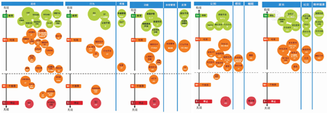系统评价根据研究结果,使用气泡图分类绘制了应用于各类儿科疾病的作业治疗方法证据等级(图1),旨在为儿童作业治疗师的临床决策提供循证依据。气泡图包括52种已确定的儿童作业治疗方法,涉及22种疾病,135项干预研究。通过研究,将类似结果放入单独的气泡中。在气泡图中,气泡大小表示已发表的证据数量(通过计算已发表的关于该主题的研究数量获得)。气泡在图y轴上的位置对应于GRADE系统评级和效果估算值(即效果不明显者靠近价值分界线,而较大的治疗效果者则远离价值分界线)。气泡颜色对应交通灯证据报警系统。这为儿童家庭及作业治疗师提供了最佳作业治疗方法的直观视图(图1)。