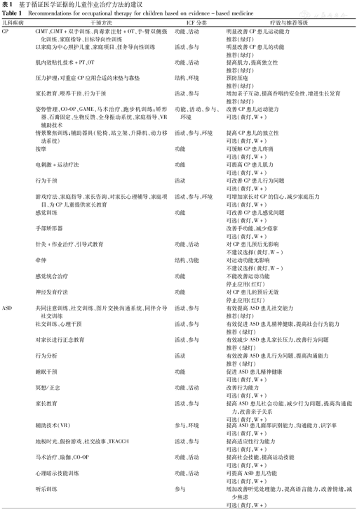 本文对135项作业治疗研究结果进行分类总结,将儿童作业治疗方法汇总为基于循证医学证据的儿童作业治疗方法建议(表1)。