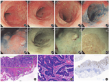治疗上,相对于传统隆起型腺瘤,结肠镜下一旦发现LST,应积极干预[3]。对于未发生黏膜下浸润或转移的LST,均可选择内镜下切除。怀疑黏膜下浅层浸润的LST行诊断性ESD也被认可。因LST很少向黏膜下层浸润,故一般直径<2 cm的LST通常采用EMR切除;直径>2 cm的LST,ESD被推荐为治疗的标准方法[7]。对于术中操作困难病灶,可行黏膜分片切除术,但复发率高,术后应密切随访。病灶不能充分暴露者,直肠常选择反转法内镜黏膜切除术,回盲部、结肠可在外力辅助牵引下手术。为了一次性完整切除病灶,获得完整病理学评估,避免手术操作时间过长,降低手术难度减少并发症,也可选择预切开内镜黏膜切除术、注水法内镜黏膜切除术、多环黏膜套扎切除术等。如电子染色放大内镜检查腺体开口不规则或者无结构,局部血管增粗、迂曲,pit分型为Ⅴ型,提示黏膜下癌,内镜超声检查黏膜下层与固有肌层分界不清,提示浸润癌,常需要外科手术治疗。若发现边缘有少量肿瘤组织残瘤或局部复发危险因素,可定期随访复查或氩离子凝固术治疗,或外科手术治疗。ESD术前完整正确标记病变,术中完整、整块切除是防止复发的关键。本病例ESD术前标记在病灶外0.5 cm,术后病理提示边切缘癌组织残留,那么是否认为此类边缘呈伪足状突出的病灶,肿瘤细胞更易向周边侵袭,这与近年来学者提出的"skirt"术后局部更易复发[8]是否存在联系尚待进一步研究。因此笔者建议类似非颗粒型LST,术前评估是术式选择的关键。