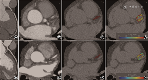 2. 冠周脂肪勾画分割:首先通过CCTA的曲面重建(CPR)图像确定病变组与对照组的冠状动脉情况(图1A、1B),再观察CCTA横断位图像中冠状动脉开口10~50 mm范围的冠状动脉(图1C、1D),之后采用Perivascular Fat Analysis Tool软件(中国数坤科技有限公司)勾画纳入的每一例患者CCS图像上的左右冠状动脉(图1E、1F),左冠状动脉以左主干起始,从冠状动脉开口处10 mm出发至左前降支,连续勾画40 mm;右冠状动脉从开口处10 mm出发,连续勾画40 mm,左回旋支因其走形迂曲并且周围脂肪较少,不予评估[5]。病变组勾画纳入的每一支冠状动脉;对照组统一勾画每一例患者的左右冠状动脉。勾画完毕后,使用Perivascular Fat Analysis Tool软件的Fat Segmentation功能,自动生成冠周的脂肪(CT值范围:-190~-30 HU)(图1G、1H)。