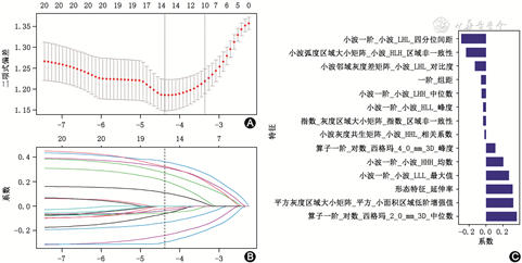 首先使用mRMR去除冗余和不相关的特征,在1 692个特征中保留30个特征。随后使用LASSO回归对影像组学特征进行筛选,利用交叉验证选择最优模型参数λ(图2A),得到的最佳λ值为0.012 5,ln(λ)=-4.38。利用得到的λ值筛选出具有非零系数的特征进行组学建模(图2B),最后筛选出来用于建模的14个组学特征(图2C)。